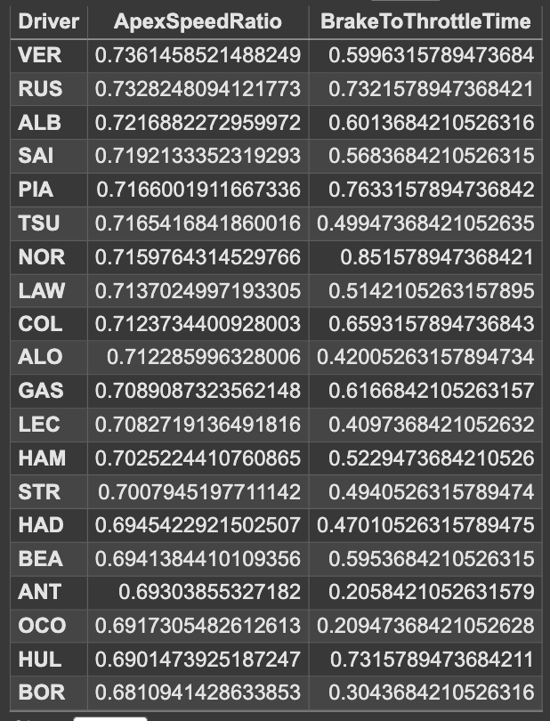 このデータで特に興味深いのはフェラーリのルクレールだ。「BrakeToThrottleTime(ブレーキを離してからスロットルを踏むまでの時間)」が全ドライバー中トップクラスに短い。これは、彼が典型的な「Vシェイプ」の使い手であり、マシンの向きを素早く変えて、立ち上がり加速を重視していることを示している。対照的に、レッドブルのフェルスタッペンは、「ApexSpeedRatio(進入速度に対するエイペックス速度の比率)」がトップであり、コーナーの最も深い部分でも速度を殺さない「Uシェイプ」の傾向が強いことを示唆している。このスタイルの違いが、タイヤへの負荷のかけ方の違いに直結する。