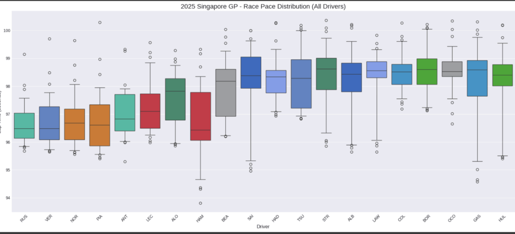 このグラフは、各ドライバーの純粋な速さと安定性を示している。箱が小さいほどラップタイムのばらつきが少なく、安定していたことを意味する。そして、箱の中の線(中央値)が低いドライバーこそ、このレースで最も速いペースを持っていたドライバーだ。驚くべきことに、レースの勝者と、この「真のレースペース」の王者は、必ずしも一致しない。このズレこそが、戦略や運がレースに与えた影響を物語っている。