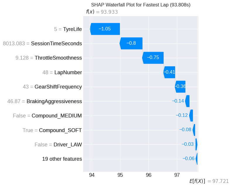 AIが示した序列の正しさを、具体的な事例で検証してみよう。このセッションの最速ラップは、フェラーリのルイス・ハミルトンが記録した93.808秒だった。このラップは、なぜ他のどのラップよりも速かったのか?AIの分析(SHAP値)は、その内訳を驚くほど明快に示してくれた。
